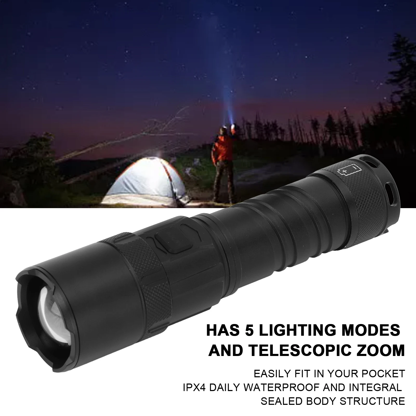This portable USB LED camping flashlight delivers ultra-bright illumination for outdoor adventures and emergencies. Constructed from durable aluminum, it’s lightweight yet strong enough to withstand rough use. The rechargeable USB design ensures convenient charging without the need for disposable batteries. Equipped with an adjustable light focus, it allows you to switch between wide floodlight and concentrated spotlight modes. The built-in power display keeps you informed of battery levels for uninterrupted use. Perfect for camping, hiking, night walks, or emergency situations, it provides reliable visibility in any condition. Compact and easy to carry, it fits comfortably in backpacks or pockets. Its ergonomic design ensures a comfortable grip for extended use. Energy-efficient LED technology delivers bright, long-lasting light. Combining durability, functionality, and convenience, this flashlight is ideal for all your outdoor lighting needs.
