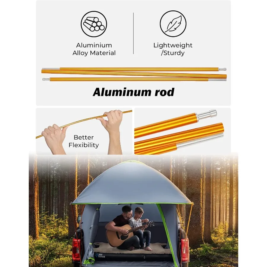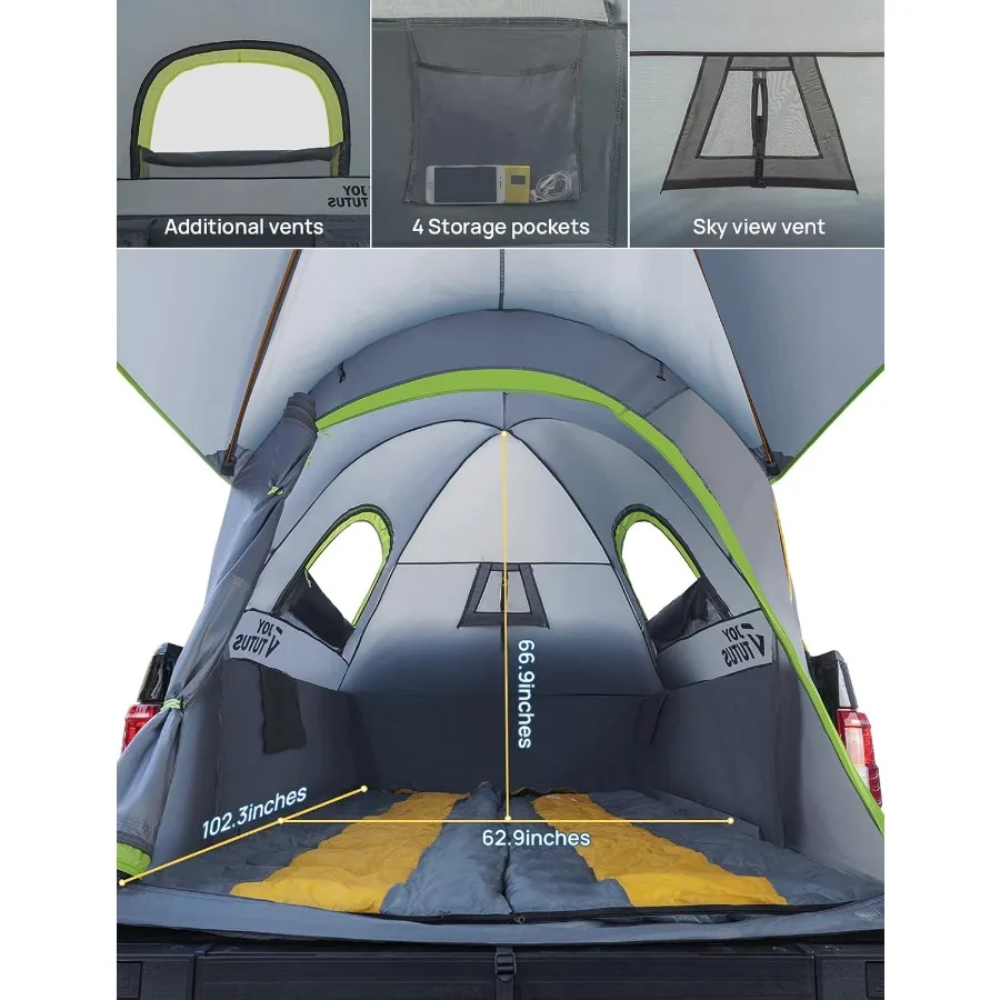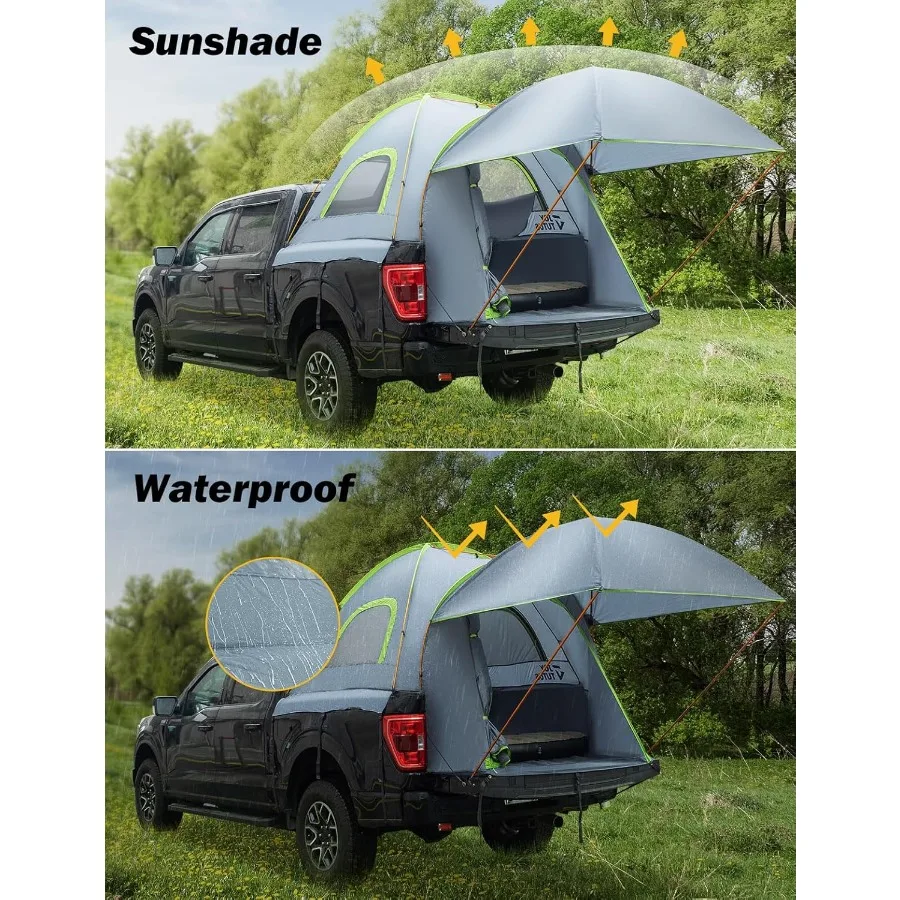 This waterproof pickup truck bed tent transforms your truck into a comfortable 2-person camping shelter. Designed for 6.5-foot truck beds, it provides a secure and elevated sleeping area off the ground. Made from durable, PU2000mm waterproof fabric, it offers reliable protection from rain and wind. The double-layer construction enhances insulation and ventilation for year-round comfort. A removable awning extends shade and shelter, creating extra space for relaxing or storing gear. Easy to set up and take down, it’s perfect for spontaneous trips or extended adventures. Reinforced poles and sturdy straps ensure stability during windy conditions. The tent’s compact design makes it convenient to store and transport between trips. Ideal for campers, travelers, and outdoor enthusiasts, it brings versatility and comfort to truck camping. Enjoy the freedom of the open road with this durable, weather-resistant truck bed tent.